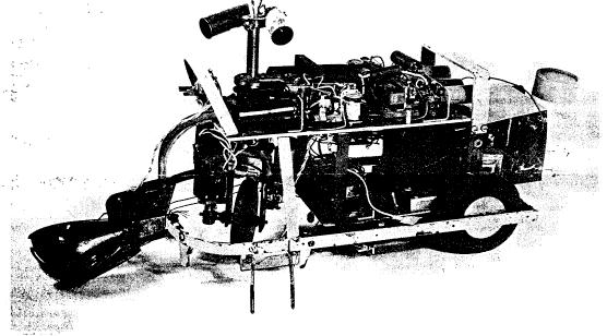 2. Squee (named after "squirrel") is an electronic robot squirrel (see Figure 1). It contains four sense organs (two phototubes, two contact switches), three acting organs (a drive motor, a steering motor, and a motor which opens and closes the scoop or "hands"), and a small brain of half a dozen relays. It will hunt for a "nut". The "nut" is a tennis ball designated by a member of the audience who steadily holds a flashlight above the ball, pointing the light at Squee. Then Squee approaches, picks up the "nut" in its "hands" (the scoop), stops paying attention to the steady light, sees in stead a light that goes on and off 120 times a second shining over its "nest", takes the "nut" to its "nest", there leaves the nuts, and then returns to hunting more "nuts". When Squee is operating, it is a dramatic and exciting example of a robot. It has been exhibited in New York, Pittsburgh, and Minneapolis, and has always entertained and excited the audience. The machine however is sensitive to the surrounding light level, and usually has to be shown in a room about 8 by 10 ft. with only a small amount of overhead light and black curtained walls. Data: completed; rather well finished but not professionally; 75% reliable; maintenance, difficult; our costs, about