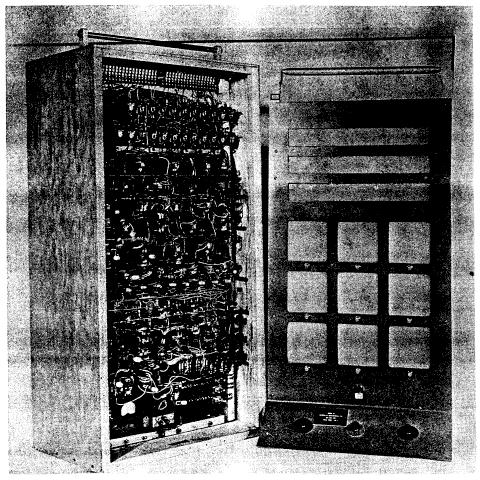 mechanical brain containing 129 relays, a stepping switch, and a five-hole paper tape feed.