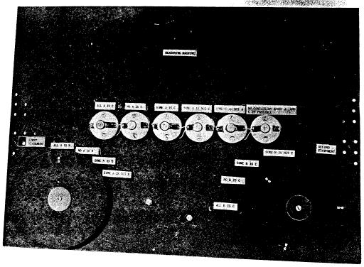-- see Figure 3) is a machine using about 90 relays, and a plastic timing drum that operates cams. It plays ordinary three-by-three tit-tat-toe with a member of the audience. It will either win or draw all the time, or it can play a less than perfect game, allowing the human player to win some of the time. The variable winning power of the machine can be selected or chosen at random. The machine was exhibited at the Guardian Relay exhibit, IRE Show, N. Y., March 1956. We believe the machine is dramatic and exciting. Data: completed; professionally finished; reliable (contains no tubes); main tenance, probably difficult; our costs so far, about $3,000.